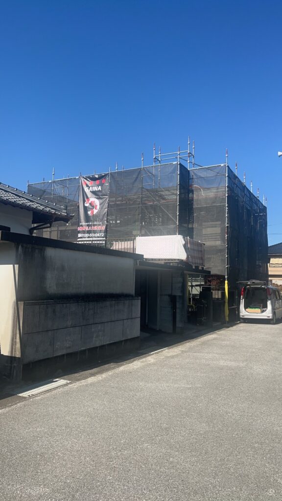 本日は足場架設・屋根・外壁の水洗い作業になります。